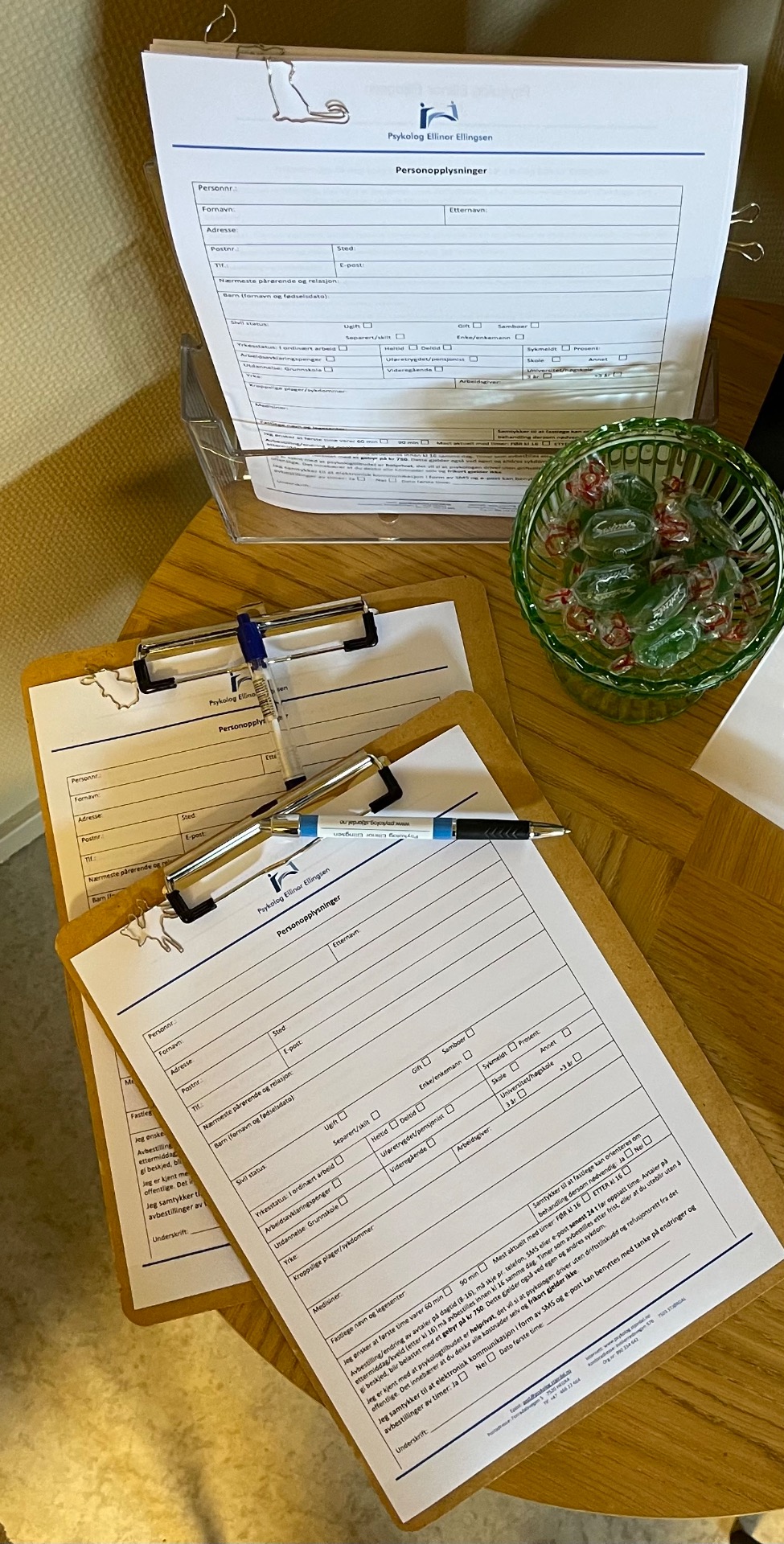 Når vi har avtalt time, vil du få enten få en e-post eller tekstmelding med timeavtalen og litt praktisk informasjon. I første time vil du bli bedt om å fylle ut et skjema med personopplysninger. Det er fint om jeg kan sende deg personopplysningsskjema pr. e-post på forhånd, slik at du kan fylle det ut og ta med til timen. Av konfidensialitetshensyn bør utfylt skjema IKKE sendes i e-post.